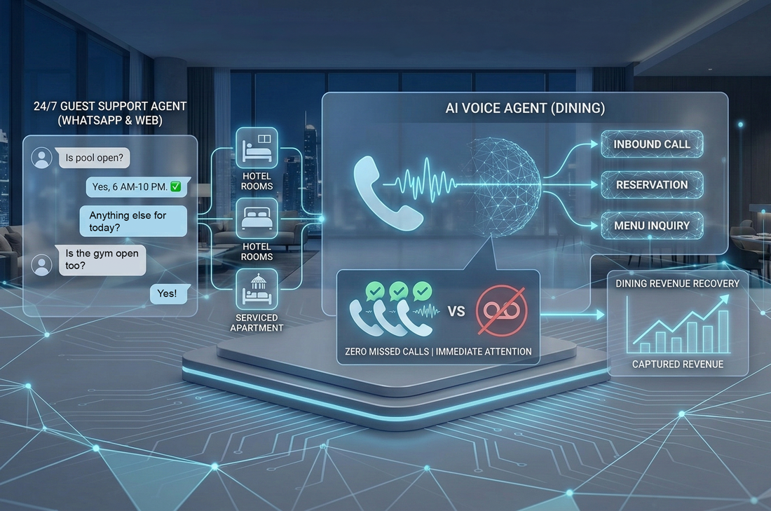 An integrated suite of WhatsApp and web-based AI agents providing instant, 24/7 guest support for luxury hotels and serviced apartments. For dining venues, an AI-powered voice agent answers inbound phone calls, handling reservations and menu inquiries with natural, human-like conversation.