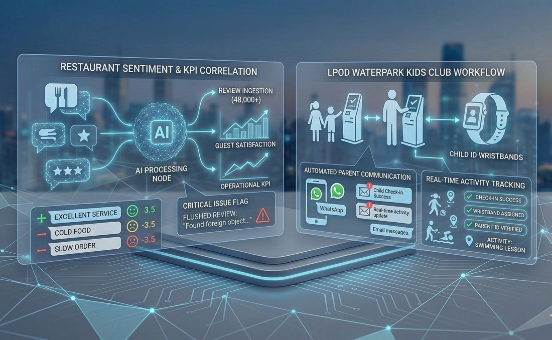 Beyond data analysis, we deploy AI-powered automation workflows for complex physical operations, such as the Kidsania Kids Club at LPOD Waterpark. This digitises the child check-in and check-out process, automates parent communication, and provides real-time activity updates.